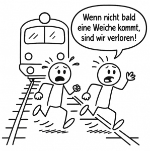 Ein passendes Bild: Zwei Männer rennen in Panik auf den Schienen vor einem Zug davon. Einer ruft: „Wenn nicht bald eine Weiche kommt, sind wir verloren!“ Sie kommen nicht auf die Idee, einfach zur Seite zu treten.