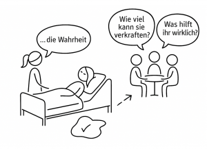 Schließlich gilt: Kommunikation ist komplex. Sie umfasst Worte, Haltung, Blick, Ton und Timing. Es geht nicht darum, die Wahrheit zu verschweigen, sondern sie auf eine Weise zu übermitteln, die verstanden werden kann. Prognosen sind nie absolut – auch wenn sie von Ärztinnen oder Pflegenden mit großer Erfahrung gegeben werden. Wir können Orientierung bieten, aber niemals alles voraussehen. Wichtig ist, das Gestern, Heute und Morgen der Patientin zu beachten und ihr Raum zu geben, ihre Realität Stück für Stück zu begreifen.